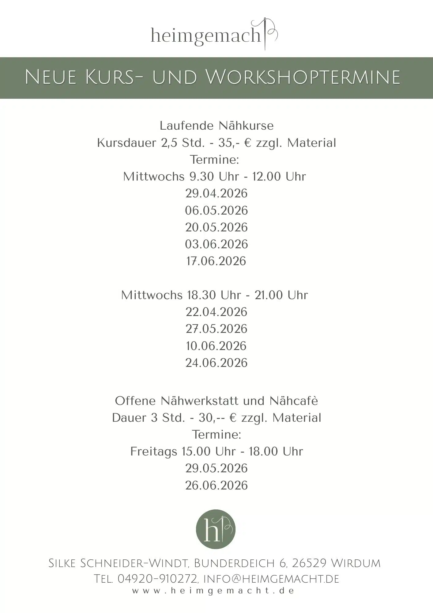 Kurse Neue Kurstermine25. April 2026/0 Kommentare/von heimgemacht https://heimgemacht.de/wp-content/uploads/2025/08/Kurse-e1777144439769.jpg 411 282 heimgemacht https://heimgemacht.de/wp-content/uploads/2024/09/Logo-fuer-Blog.png heimgemacht2026-04-25 21:12:172026-04-25 21:14:46Neue Kurstermine